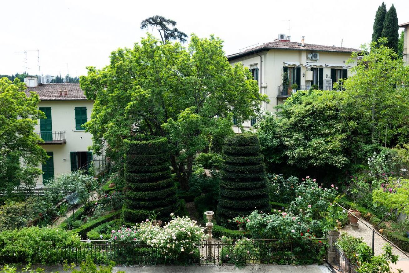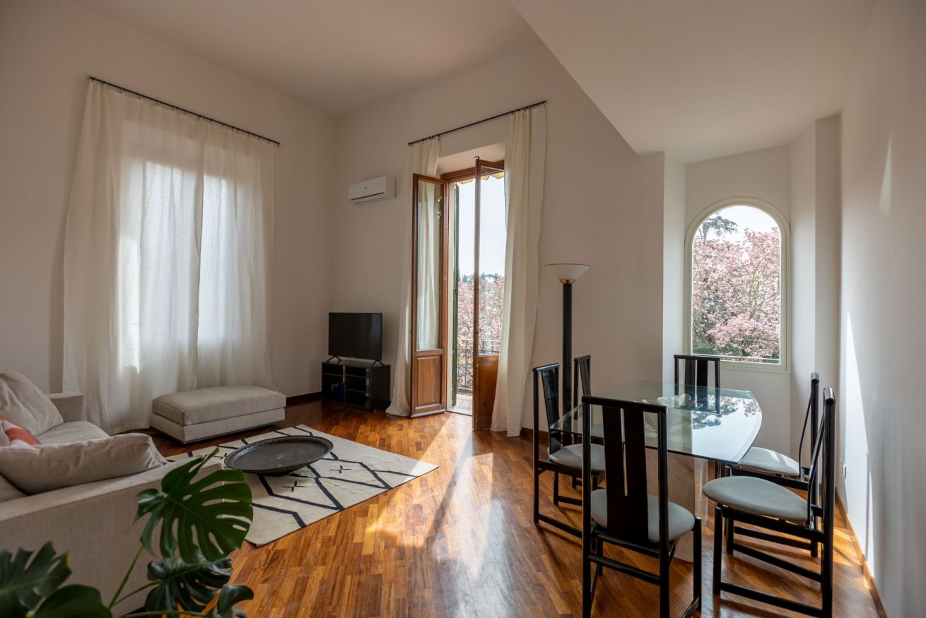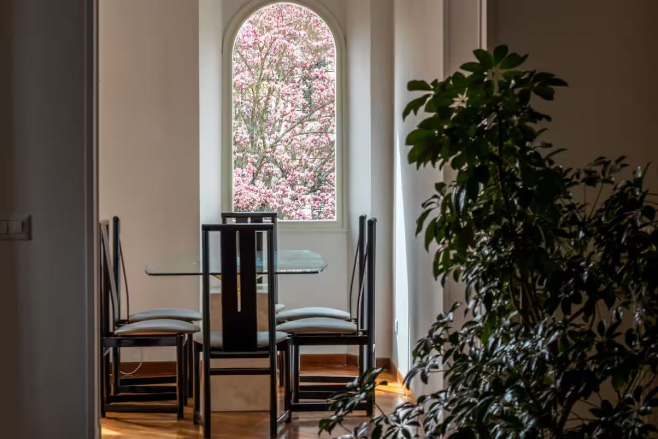 The apartment is quiet and refined, featuring a balcony with a view of a beautifully maintained Italian garden, offering a peaceful spot to relax and enjoy the atmosphere of the city.